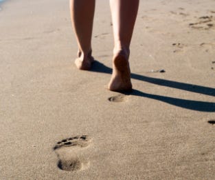 One man, alone, but not apparently lonely, walked calmly along the long yellow strand, its miniscule small particles of quartz compressing his feet, leaving behind him a path of images, each a reverse of a singular human foot. Had he looked back, he would have seen that there lay the passing record of the way he had chosen, a track of his past in the slow hours he had walked that day. In front lay a trackless plain, as yet unchosen, as virginal as he.